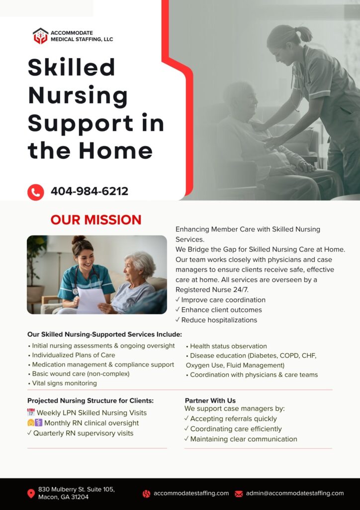 At Accommodate Medical Staffing, LLC, we are committed to elevating the standard of in-home care through skilled nursing support. Whether your clients need ongoing monitoring, education, or clinical oversight, we’re here to help.