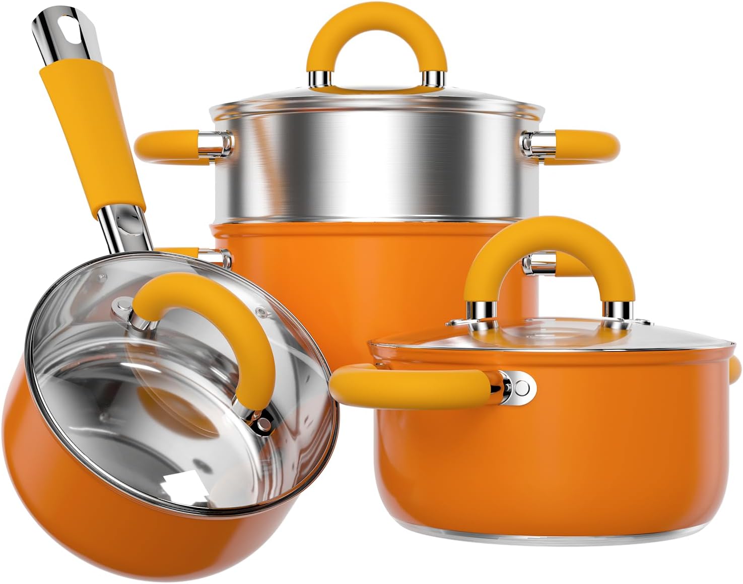 This 7-piece set includes 4 QT, 3 QT, and 2 QT pots with lids plus a steamer insert. Crafted from high-quality 18/8 stainless steel with vibrant orange exteriors, it combines elegance with long-lasting durability.